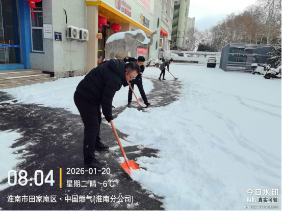 风雪虽寒,服务暖心。为保障市民正常办理燃气业务,淮南中燃以雪为令、闻雪而动,总经理率先垂范,手持铁锹,与员工们共同清扫出一条畅通无阻的“暖心通道”。不仅为前来办理业务的市民开辟出安全通道,确保线下业务办理安全、有序、高效,更及时打通了安全“便民通道”,彰显了淮南中燃的责任担当。
