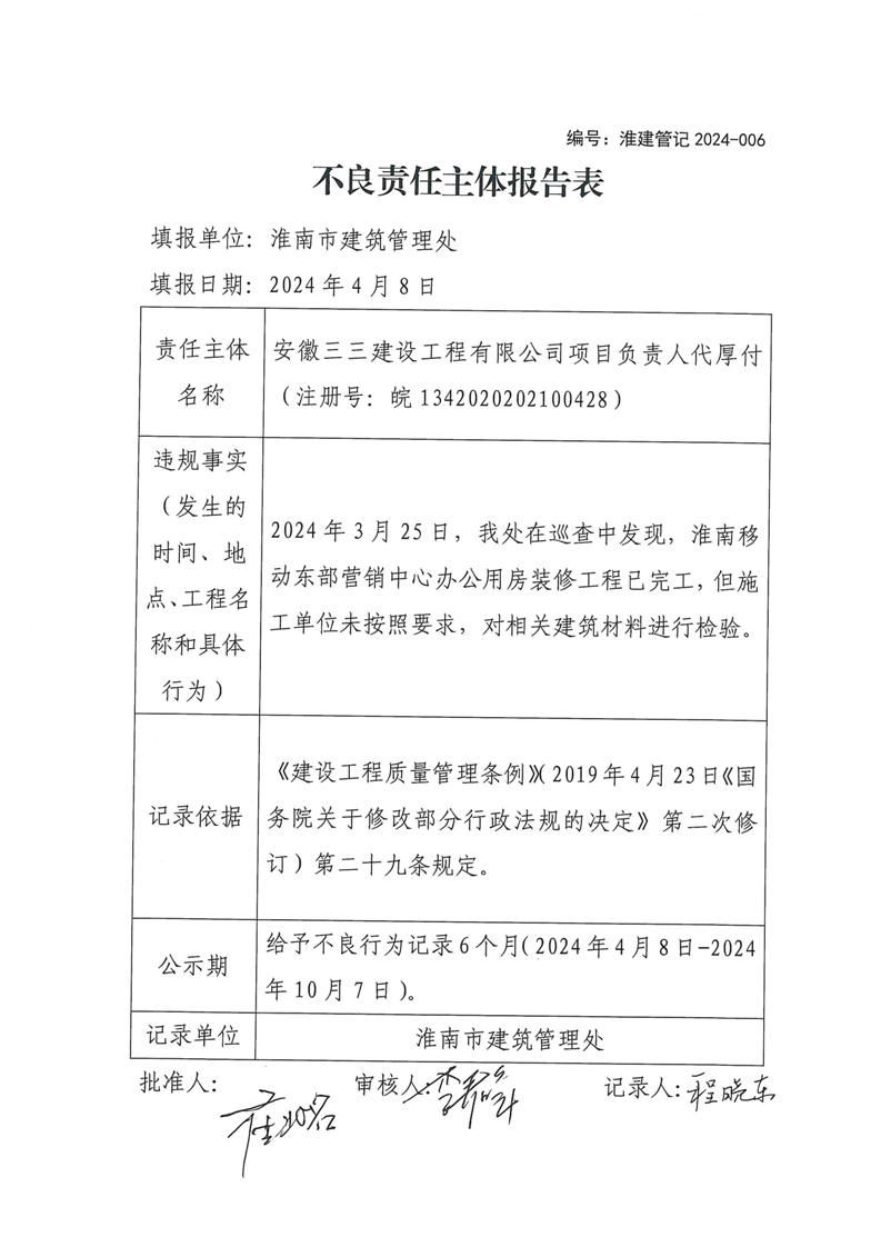 不良记录:安徽三三建设工程有限公司项目负责人代厚付