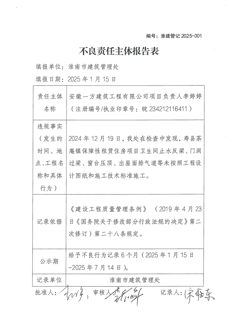 不良记录:安徽一方建筑工程有限公司项目负责人李婷婷