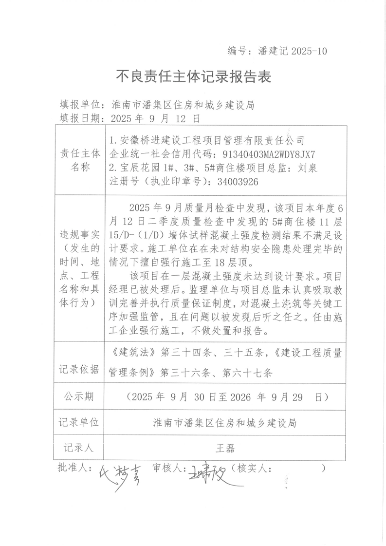不良记录:安徽桥进建设工程项目管理有限责任公司,宝辰花园1#、3#、5#商住楼项目总监刘泉