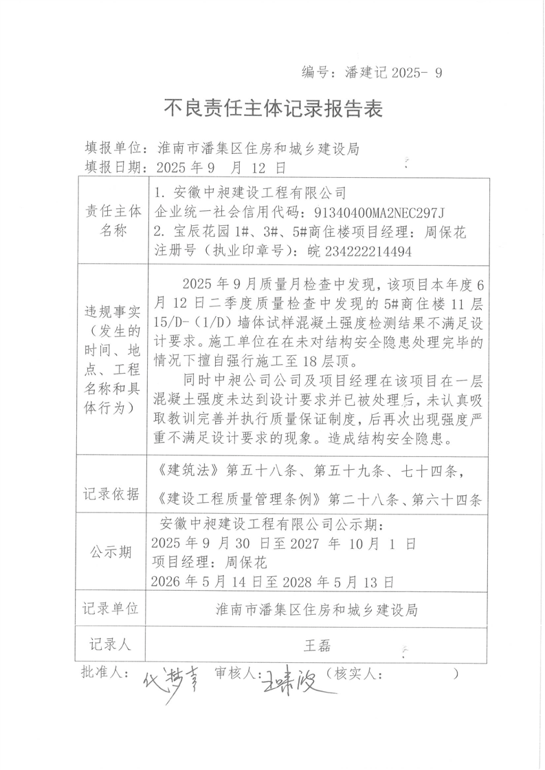 不良记录:安徽中昶建设工程有限公司,宝辰花园1#、3#、5#商住楼项目经理周保花