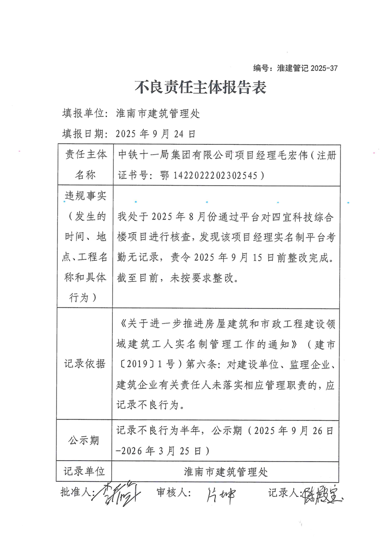 不良记录:中铁十一局集团有限公司项目经理毛宏伟