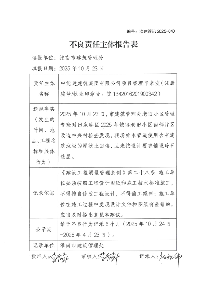 不良记录:中能建建筑集团有限公司项目经理辛来友