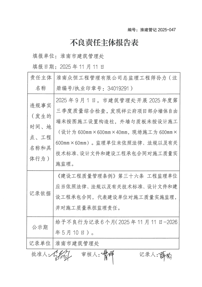 不良记录:淮南众恒工程管理有限公司总监理工程师孙力