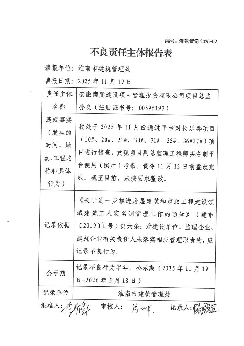 不良记录:安徽南巽建设项目管理投资有限公司项目总监孙良