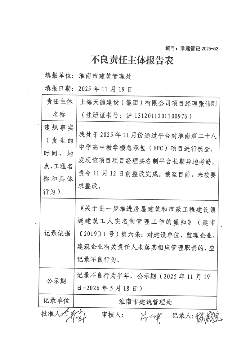 不良记录:上海天德建设(集团)有限公司项目经理张伟刚