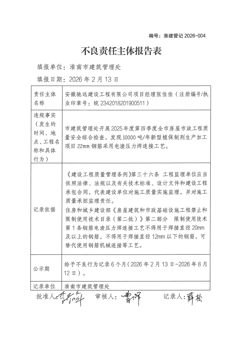 不良记录:安徽驰远建设工程有限公司项目经理张佳佳