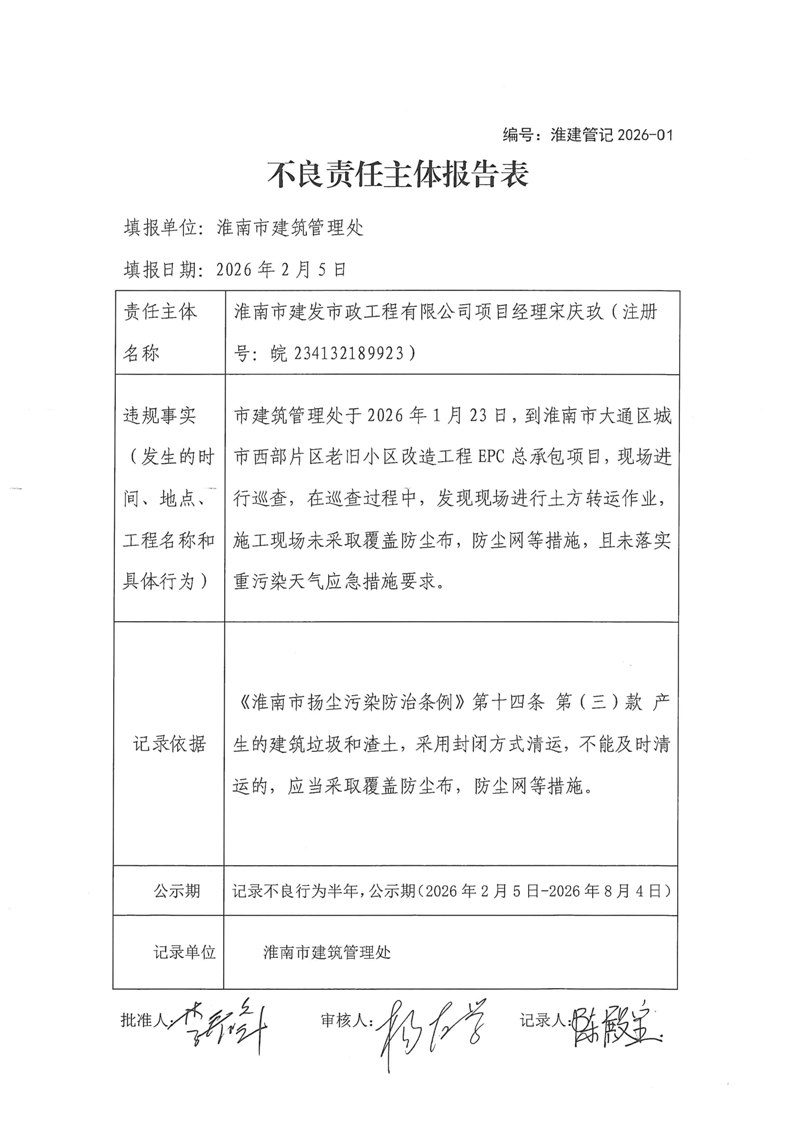 不良记录:淮南市建发市政工程有限公司项目经理宋庆玖