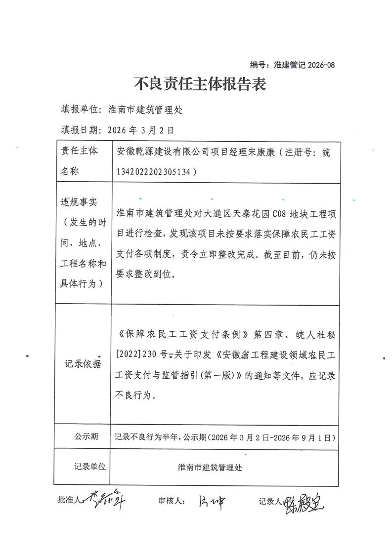 不良记录:安徽乾源建设有限公司项目经理宋康康